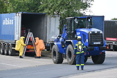 Das Entladen des Containers, der verschiedene Dinge geladen hatte – darunter auch Gefahrgut -, dauerte bis etwa 22 Uhr. Diese Tätigkeit konnte vorsichtshalber nur von Kräften in Chemikalienschutzanzügen mit Unterstützung eines Radladers vom THW-Ortsverband Barmstedt vorgenommen werden.