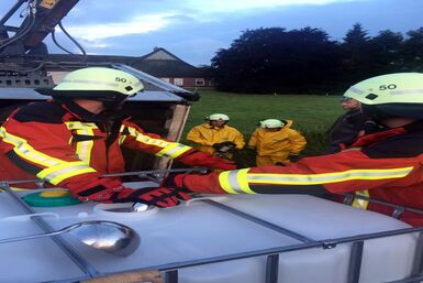 Da während der Bergungsarbeiten Diesel aus dem beschädigten LKW ausgelaufen war, wurde gegen 19.45 Uhr der Löschzug Gefahrgut an die Einsatzstelle gerufen. Mit Sauggeräten nahmen die etwa 25 Kräfte der Spezialeinheit rund 500 Liter Dieselwassergemisch auf und verhinderten mit Ölschlengeln auf dem Graben eine weitere Ausbreitung des Kraftstoffes.